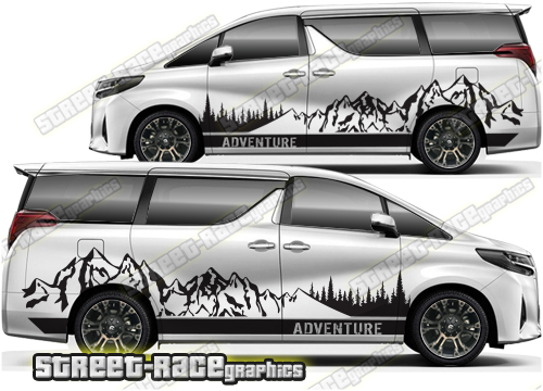 Toyota Alphard Campervan graphics. Great for a camper or race van conversion. They are a universal fit to suit all Toyota Alphard vans and facelift variants from MK1 onwards. There are no cutouts for the wheel arches, door handles or door lines, these will require trimming during fitting.