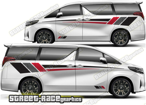 Toyota Alphard graphics. Great for a camper or race van conversion. They are a universal fit to suit all Toyota Alphard vans and facelift variants from MK1 onwards. There are no cutouts for the wheel arches, door handles or door lines, these will require trimming during fitting.