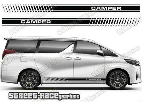 Toyota Alphard racing stripes. Great for a camper or race van conversion. They are a universal fit to suit all Toyota Alphard vans and facelift variants from MK1 onwards. There are no cutouts for the wheel arches or door lines, these will require trimming during fitting.