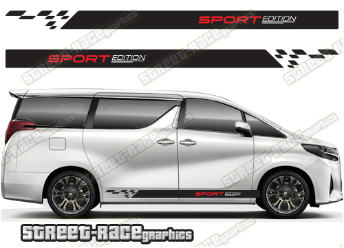 Toyota Alphard racing stripes. Great for a camper or race van conversion. They are a universal fit to suit all Toyota Alphard vans and facelift variants from MK1 onwards. There are no cutouts for the wheel arches or door lines, these will require trimming during fitting.