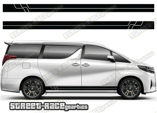 Toyota Alphard racing stripes. Great for a camper or race van conversion. They are a universal fit to suit all Toyota Alphard vans and facelift variants from MK1 onwards. There are no cutouts for the wheel arches or door lines, these will require trimming during fitting.