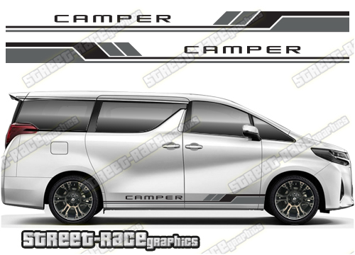 Toyota Alphard racing stripes. Great for a camper or race van conversion. They are a universal fit to suit all Toyota Alphard vans and facelift variants from MK1 onwards. There are no cutouts for the wheel arches or door lines, these will require trimming during fitting.