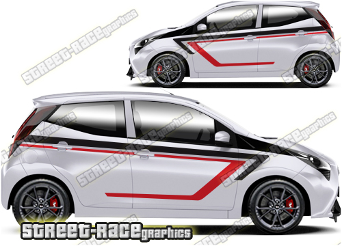 Toyota Aygo graphics. These large race-inspired decals are perfect for both street, rally and track-day cars. They are a universal fit to suit all Toyota Aygo cars and facelift variants from MK1 onwards. There are no cutouts for the door handles, wheel arches or door lines; these will require trimming during fitting.