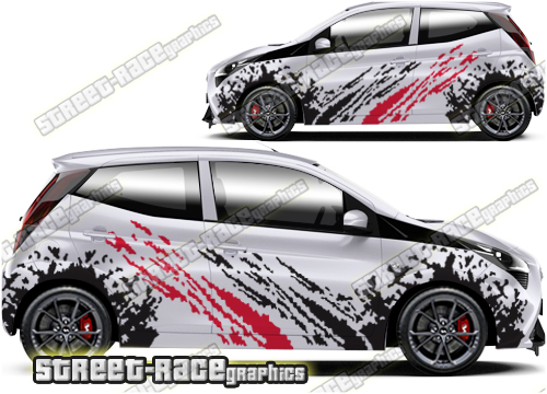 Toyota Aygo graphics. These large race-inspired decals are perfect for both street, rally and track-day cars. They are a universal fit to suit all Toyota Aygo cars and facelift variants from MK1 onwards. There are no cutouts for the door handles, wheel arches or door lines; these will require trimming during fitting.