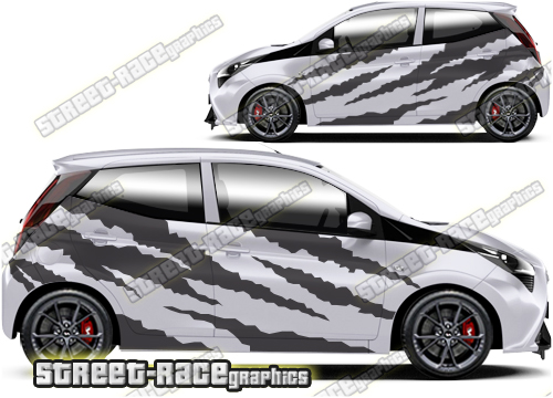 Toyota Aygo graphics. These large race-inspired decals are perfect for both street, rally and track-day cars. They are a universal fit to suit all Toyota Aygo cars and facelift variants from MK1 onwards. There are no cutouts for the door handles, wheel arches or door lines; these will require trimming during fitting.