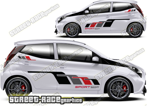 Toyota Aygo graphics. These large race-inspired decals are perfect for both street, rally and track-day cars. They are a universal fit to suit all Toyota Aygo cars and facelift variants from MK1 onwards. There are no cutouts for the door handles, wheel arches or door lines; these will require trimming during fitting.