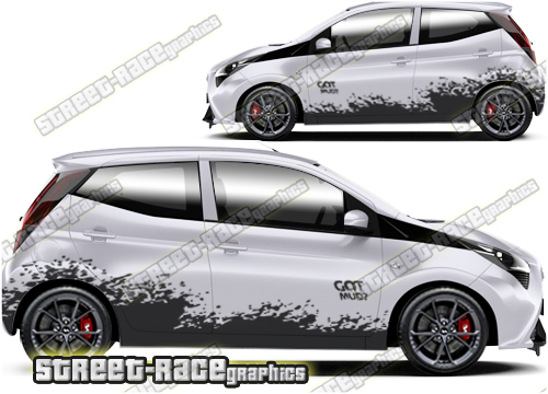 Toyota Aygo graphics. These large race-inspired decals are perfect for both street, rally and track-day cars. They are a universal fit to suit all Toyota Aygo cars and facelift variants from MK1 onwards. There are no cutouts for the door handles, wheel arches or door lines; these will require trimming during fitting.
