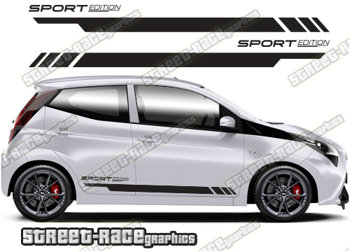 Toyota Aygo racing stripes. They are a universal fit to suit all Toyota Aygo cars and facelift variants from MK1 onwards. There are no cutouts for the wheel arches or door lines; these will require trimming during fitting.