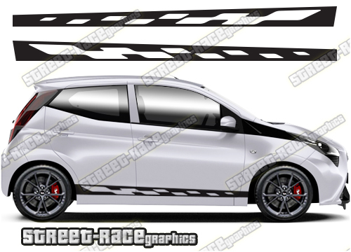 Toyota Aygo racing stripes. They are a universal fit to suit all Toyota Aygo cars and facelift variants from MK1 onwards. There are no cutouts for the wheel arches or door lines; these will require trimming during fitting.
