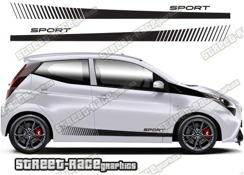 Toyota Aygo racing stripes. They are a universal fit to suit all Toyota Aygo cars and facelift variants from MK1 onwards. There are no cutouts for the wheel arches or door lines; these will require trimming during fitting.