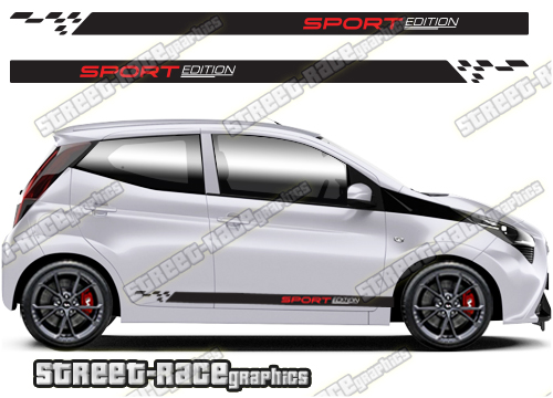 Toyota Aygo racing stripes. They are a universal fit to suit all Toyota Aygo cars and facelift variants from MK1 onwards. There are no cutouts for the wheel arches or door lines; these will require trimming during fitting.
