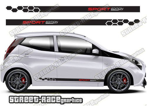 Toyota Aygo racing stripes. They are a universal fit to suit all Toyota Aygo cars and facelift variants from MK1 onwards. There are no cutouts for the wheel arches or door lines; these will require trimming during fitting.