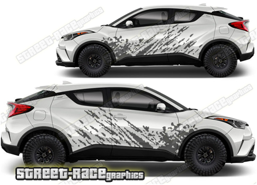 Toyota CH-R graphics. They are shown on the first generation CH-R but they can be trimmed to fit all later versions and facelift variants. The decals are not pre-cut for any specific Toyota CH-R version; they do not have any door handle cutouts, wheel arch or door line splits. These will require trimming during fitting. Vinyl will not stick to unpainted textured plastics.