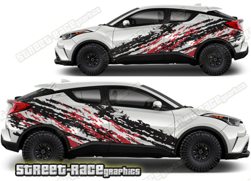 Toyota CH-R graphics. They are shown on the first generation CH-R but they can be trimmed to fit all later versions and facelift variants. The decals are not pre-cut for any specific Toyota CH-R version; they do not have any door handle cutouts, wheel arch or door line splits. These will require trimming during fitting. Vinyl will not stick to unpainted textured plastics.