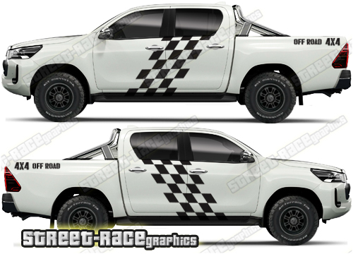 Toyota Hilux large graphics. They are shown on the 8th generation dual cab (MK8), but they can be trimmed to fit all cab versions (single, crew and double cab) and facelift variants. The decals do not have any door handle cutouts, wheel arch or door line splits. These will require trimming during fitting. Vinyl will not stick to textured surfaces such as unpainted wheel arch flares or raptor paint.
