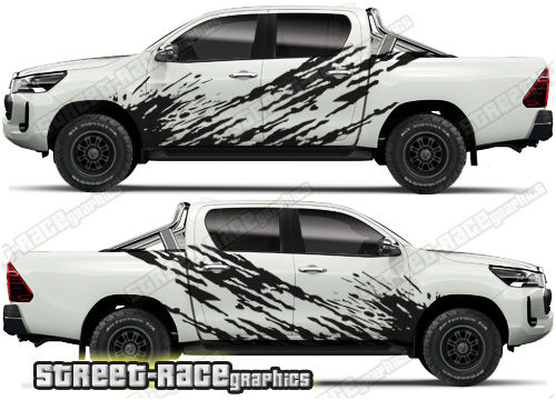 Toyota Hilux large graphics. They are shown on the 8th generation dual cab (MK8), but they can be trimmed to fit all cab versions (single, crew and double cab) and facelift variants. The decals do not have any door handle cutouts, wheel arch or door line splits. These will require trimming during fitting. Vinyl will not stick to textured surfaces such as unpainted wheel arch flares or raptor paint.