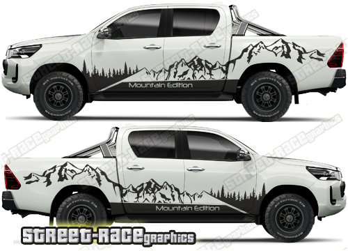 Toyota Hilux large graphics. They are shown on the 8th generation dual cab (MK8), but they can be trimmed to fit all cab versions (single, crew and double cab) and facelift variants. The decals do not have any door handle cutouts, wheel arch or door line splits. These will require trimming during fitting. Vinyl will not stick to textured surfaces such as unpainted wheel arch flares or raptor paint.