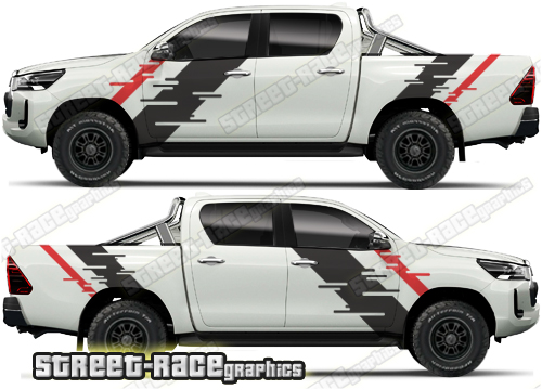 Toyota Hilux large graphics. They are shown on the 8th generation dual cab (MK8), but they can be trimmed to fit all cab versions (single, crew and double cab) and facelift variants. The decals do not have any door handle cutouts, wheel arch or door line splits. These will require trimming during fitting. Vinyl will not stick to textured surfaces such as unpainted wheel arch flares or raptor paint.