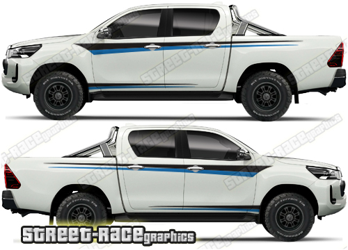 Toyota Hilux large graphics. They are shown on the 8th generation dual cab (MK8), but they can be trimmed to fit all cab versions (single, crew and double cab) and facelift variants. The decals do not have any door handle cutouts, wheel arch or door line splits. These will require trimming during fitting. Vinyl will not stick to textured surfaces such as unpainted wheel arch flares or raptor paint.