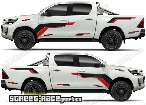 Toyota Hilux large graphics. They are shown on the 8th generation dual cab (MK8), but they can be trimmed to fit all cab versions (single, crew and double cab) and facelift variants. The decals do not have any door handle cutouts, wheel arch or door line splits. These will require trimming during fitting. Vinyl will not stick to textured surfaces such as unpainted wheel arch flares or raptor paint.