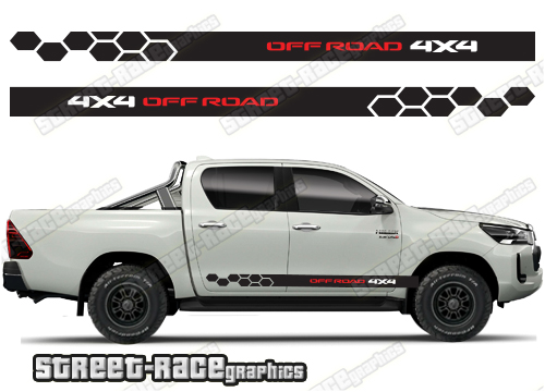 Toyota Hilux side graphics. They are shown on the 8th generation dual cab (MK8), but they can be trimmed to fit all cab versions (single, crew and double cab) and facelift variants. The decals do not have any door handle cutouts, wheel arch or door line splits. These will require trimming during fitting. Vinyl will not stick to textured surfaces such as unpainted wheel arch flares or raptor paint.