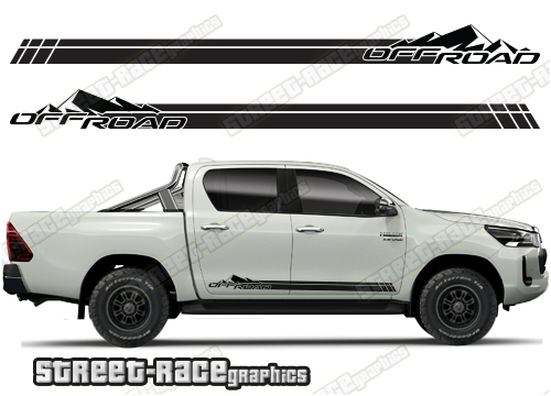 Toyota Hilux large graphics. They are shown on the 8th generation dual cab (MK8), but they can be trimmed to fit all cab versions (single, crew and double cab) and facelift variants. The decals do not have any door handle cutouts, wheel arch or door line splits. These will require trimming during fitting. Vinyl will not stick to textured surfaces such as unpainted wheel arch flares or raptor paint.