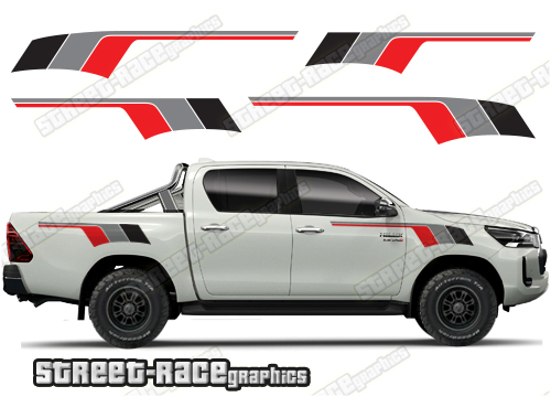 Toyota Hilux large graphics. They are shown on the 8th generation dual cab (MK8), but they can be trimmed to fit all cab versions (single, crew and double cab) and facelift variants. The decals do not have any door handle cutouts, wheel arch or door line splits. These will require trimming during fitting. Vinyl will not stick to textured surfaces such as unpainted wheel arch flares or raptor paint.
