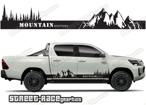 Toyota Hilux large graphics. They are shown on the 8th generation dual cab (MK8), but they can be trimmed to fit all cab versions (single, crew and double cab) and facelift variants. The decals do not have any door handle cutouts, wheel arch or door line splits. These will require trimming during fitting. Vinyl will not stick to textured surfaces such as unpainted wheel arch flares or raptor paint.