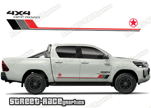 Toyota Hilux side graphics. They are shown on the 8th generation dual cab (MK8), but they can be trimmed to fit all cab versions (single, crew and double cab) and facelift variants. The decals do not have any door handle cutouts, wheel arch or door line splits. These will require trimming during fitting. Vinyl will not stick to textured surfaces such as unpainted wheel arch flares or raptor paint.