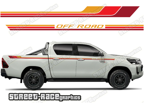 Toyota Hilux side graphics. They are shown on the 8th generation dual cab (MK8), but they can be trimmed to fit all cab versions (single, crew and double cab) and facelift variants. The decals do not have any door handle cutouts, wheel arch or door line splits. These will require trimming during fitting. Vinyl will not stick to textured surfaces such as unpainted wheel arch flares or raptor paint.