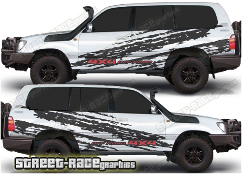 Toyota Land Cruiser 80 & 100 series graphics. They can be trimmed to fit any of the 80 or 100 series variants (Prado, 105 etc). The decals are not pre-cut for the wheel arch shape, so they can be fitted with or without after-market flares.