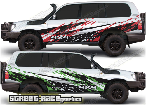 Toyota Land Cruiser 80 & 100 series graphics. They can be trimmed to fit any of the 80 or 100 series variants (Prado, 105 etc). The decals are not pre-cut for the wheel arch shape, so they can be fitted with or without after-market flares.