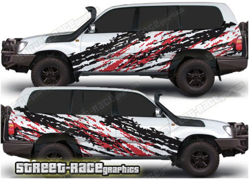 Toyota Land Cruiser 80 & 100 series graphics. They can be trimmed to fit any of the 80 or 100 series variants (Prado, 105 etc). The decals are not pre-cut for the wheel arch shape, so they can be fitted with or without after-market flares.
