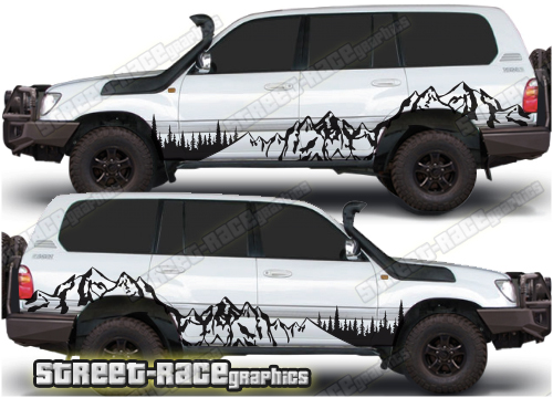 Toyota Land Cruiser 80 & 100 series graphics. They can be trimmed to fit any of the 80 or 100 series variants (Prado, 105 etc). The decals are not pre-cut for the wheel arch shape, so they can be fitted with or without after-market flares.