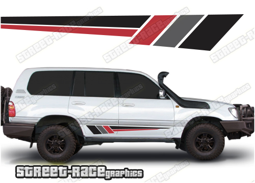 Toyota Land Cruiser 80 & 100 series graphics. They can be trimmed to fit any of the 80 or 100 series variants (Prado, 105 etc). The decals are not pre-cut for the wheel arch shape, so they can be fitted with or without after-market flares.