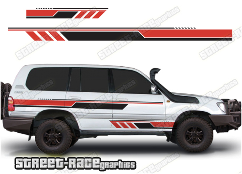 Toyota Land Cruiser 80 & 100 series racing stripe graphics. They can be trimmed to fit any of the 80 or 100 series variants (Prado, 105 etc). The decals are not pre-cut for the wheel arch shape, so they can be fitted with or without after-market flares.