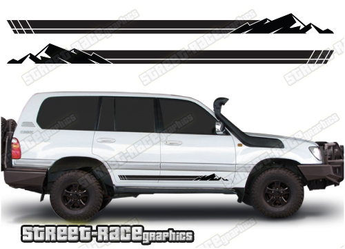 Toyota Land Cruiser 80 & 100 series racing stripe graphics. They can be trimmed to fit any of the 80 or 100 series variants (Prado, 105 etc). The decals are not pre-cut for the wheel arch shape, so they can be fitted with or without after-market flares.