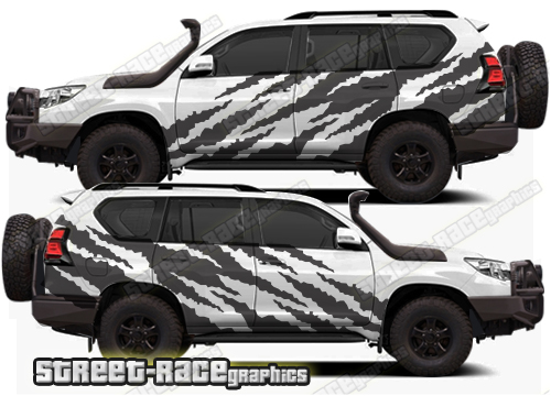 Toyota Land Cruiser 200 & 300 series graphics. They can be trimmed to fit any of the 200 or 300 series variants (Prado, Fortuner, 4Runner etc). The decals are not pre-cut for the wheel arch shape, so they can be fitted with or without after-market flares.