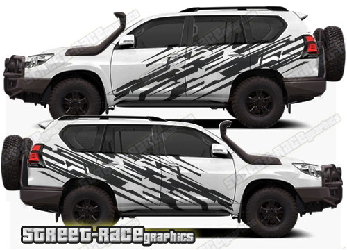 Toyota Land Cruiser 200 & 300 series graphics. They can be trimmed to fit any of the 200 or 300 series variants (Prado, Fortuner, 4Runner etc). The decals are not pre-cut for the wheel arch shape, so they can be fitted with or without after-market flares.