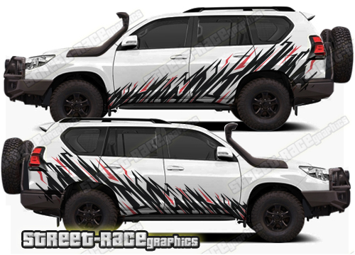 Toyota Land Cruiser 200 & 300 series graphics. They can be trimmed to fit any of the 200 or 300 series variants (Prado, Fortuner, 4Runner etc). The decals are not pre-cut for the wheel arch shape, so they can be fitted with or without after-market flares.