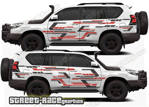 Toyota Land Cruiser 200 & 300 series graphics. They can be trimmed to fit any of the 200 or 300 series variants (Prado, Fortuner, 4Runner etc). The decals are not pre-cut for the wheel arch shape, so they can be fitted with or without after-market flares.