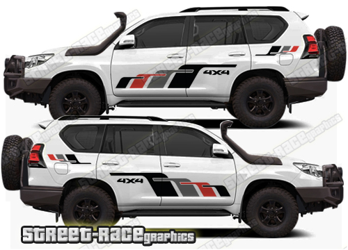 Toyota Land Cruiser 200 & 300 series graphics. They can be trimmed to fit any of the 200 or 300 series variants (Prado, Fortuner, 4Runner etc). The decals are not pre-cut for the wheel arch shape, so they can be fitted with or without after-market flares.