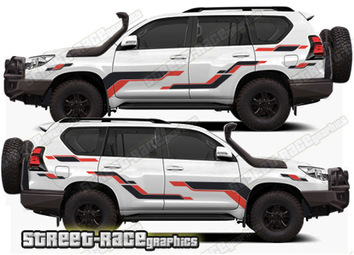 Toyota Land Cruiser 200 & 300 series graphics. They can be trimmed to fit any of the 200 or 300 series variants (Prado, Fortuner, 4Runner etc). The decals are not pre-cut for the wheel arch shape, so they can be fitted with or without after-market flares.