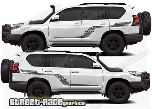 Toyota Land Cruiser 200 & 300 series graphics. They can be trimmed to fit any of the 200 or 300 series variants (Prado, Fortuner, 4Runner etc). The decals are not pre-cut for the wheel arch shape, so they can be fitted with or without after-market flares.