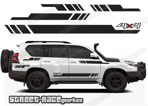 Toyota Land Cruiser 200 & 300 series racing stripes. They can be trimmed to fit any of the 200 or 300 series variants (Prado, Fortuner, 4Runner etc). The decals are not pre-cut for the wheel arch shape, so they can be fitted with or without after-market flares.