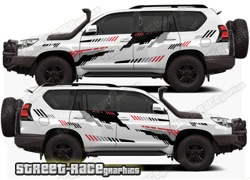 Toyota Land Cruiser 200 & 300 series graphics. They can be trimmed to fit any of the 200 or 300 series variants (Prado, Fortuner, 4Runner etc). The decals are not pre-cut for the wheel arch shape, so they can be fitted with or without after-market flares.