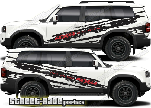 Toyota Land Cruiser 250 graphics. The decals are not pre-cut for the wheel arch shape, so they can be fitted with or without after-market flares.