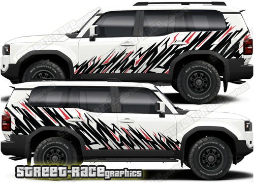 Toyota Land Cruiser 250 graphics. The decals are not pre-cut for the wheel arch shape, so they can be fitted with or without after-market flares.