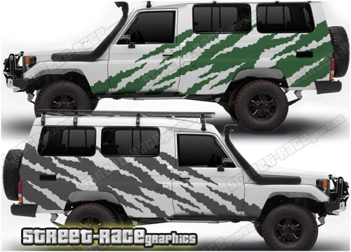 Toyota Land Cruiser 70 series graphics. They are shown on the larger Troop Carrier but they can be trimmed to fit any of the 70 (J70) series variants (Troopy, Wagon, Single Cab, Dual cab, Pickup, Workmate etc). These variants include the 73, 75, 76, 78 and 79 series. The decals are not pre-cut for the wheel arch shape, so they can be fitted with or without after-market flares.