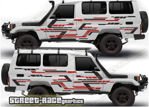 Toyota Land Cruiser 70 series graphics. They are shown on the larger Troop Carrier but they can be trimmed to fit any of the 70 (J70) series variants (Troopy, Wagon, Single Cab, Dual cab, Pickup, Workmate etc). These variants include the 73, 75, 76, 78 and 79 series. The decals are not pre-cut for the wheel arch shape, so they can be fitted with or without after-market flares.